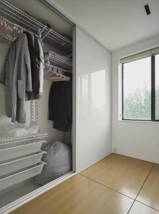 客厅与卧室之间安装推拉门,同时设计木质顶衣帽柜,既保证了空间的私密性,又满足了生活收纳的需求,自然实用。