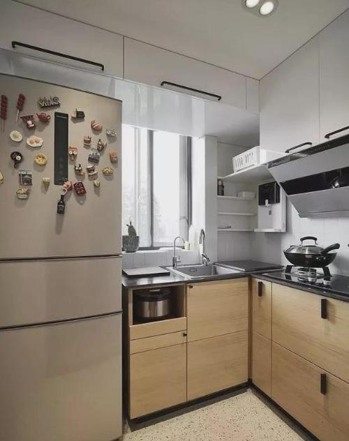 整个厨房空间定制了L型橱柜控制台和吊柜。同时预留了冰箱的位置。设计特别合理实用。木质橱柜结合黑色石材台面,自然耐用。