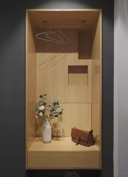 入口玄关空间定制悬浮镶嵌换鞋凳,墙上设计壁龛,可在出入口方便放置一些装饰品或小物件,整体采用木质实心板设计,效果自然舒适美观实用。