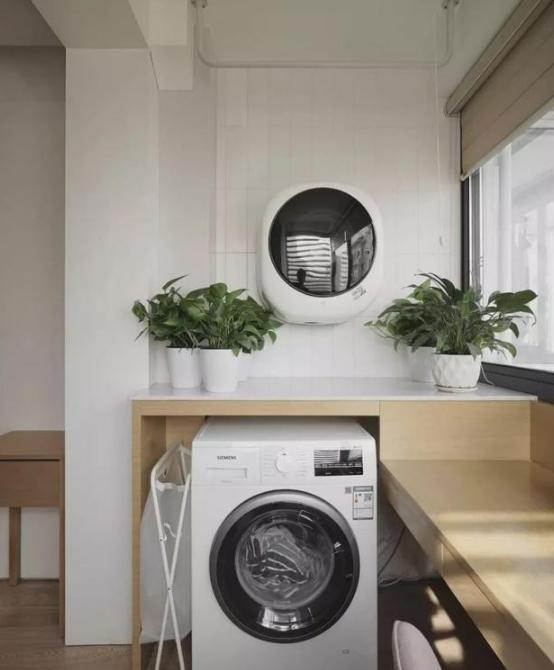沿桌台定制洗衣机台面,将洗衣机刚好插入设计,隐藏上下水。整体效果美观实用。