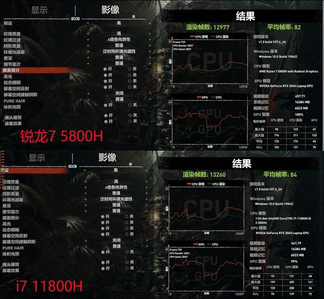 《古墓丽影:暗影》2K高画质,锐龙7 5800H款82fps,i7 11800H款84fps。