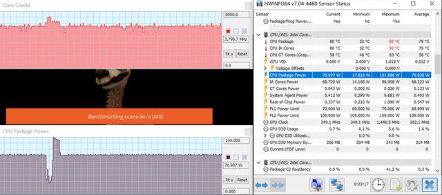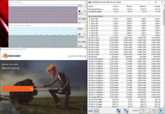 ▲锐龙7 5800H渲染过程,自动风扇模式,所以比考机低了4W左右