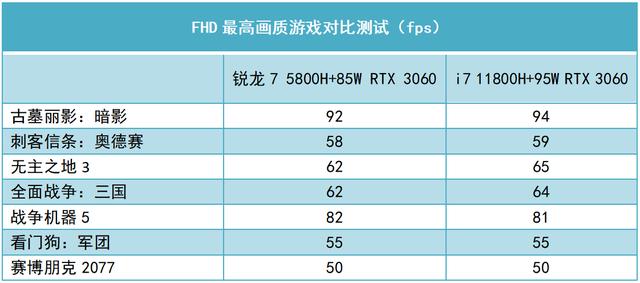那么,在显卡功率低10W的情况下,锐龙7 5800H PK i7 11800H游戏实战,结果如何?实际游戏测试有些出人意料!虽然i7 11800H+95W RTX 3060理论上更有优势,但7款游戏中,仅4款游戏有微弱优势,2款打平,1款则不敌锐龙7 5800H+85W RTX 3060。