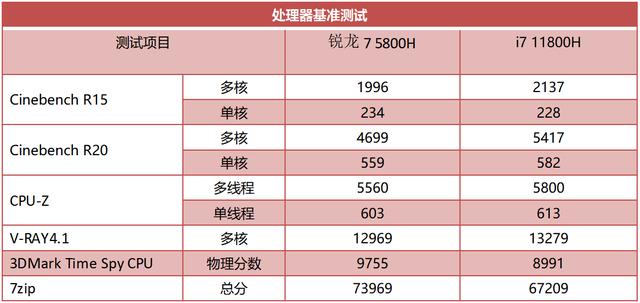 7 5800H要领先i7 11800H。在CPU-Z和V-RAY4.1测试中两者比较接近,11800H略有优势。而在3DMark Time Spy CPU中,锐龙7 5800H则超过了i7 11800H——理论游戏性能反而更强一些,这一点也在后面的游戏测试中有所体现。