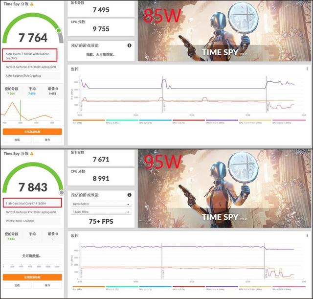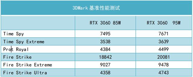 注意,测试时锐龙7 5800H款机型测试时的独显功率最高是85W(该机后来有了可升级95W显卡功率的BIOS固件),相比i7 11800H的95W,如下面3D Mark中的各项基准测试数据,在理论性能方面的确是低一点。