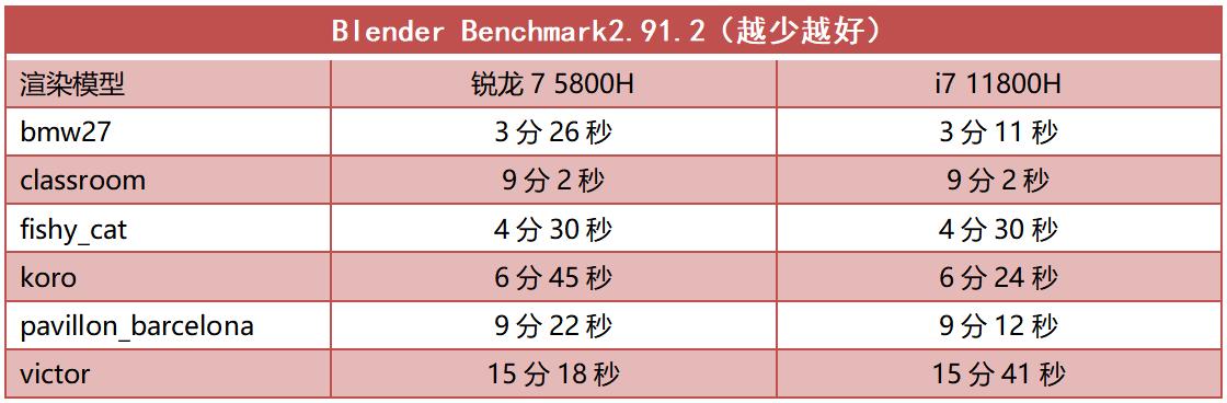 接下来是处理器满载测试环节,主要考查处理器满载测试性能。选择的项目是Blender六个场景连续渲染。这里需要说明一下:由于两台机型是先后测试的,所以在满载渲染测试项目中设定有些不同,酷睿版是最大风扇模式下跑的渲染测试,跑满了70W;而锐龙版为了模拟日常使用,则是在自动风扇模式下跑的渲染测试,渲染时功率为50W。因此,下面的数据对比前提是:70W i7 11800H对比50W 锐龙7 5800H,11800H功耗足足比5800H高了20W。