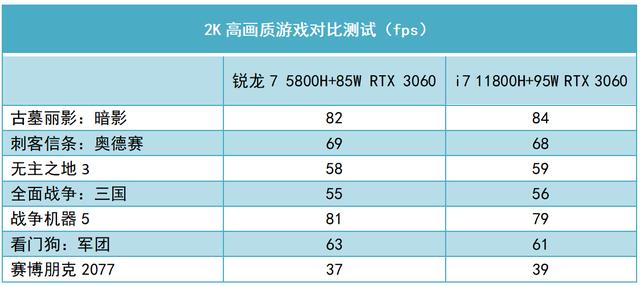 接着牛叔将分辨率提升到2K级别(2560×1440,均采用外接显示器),测试结果就更有趣了。7款游戏中,锐龙7 5800H+85W RTX 3060反而胜了3款,在显卡功耗更低的情况下,基本上和11800H打平了。当然,不管5800H还是11800H领先,都是几帧的差距,在实际游戏体验中基本上感觉不到区别。