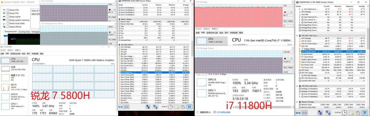 从功率而言,锐龙7 5800H低于i7 11800H,而从频率来看,锐龙7 5800H反超i7 11800H——而两者结合来看,则说明得益于Zen3架构和7nm制程优势,锐龙7 5800H的能效比要大幅度强于i7 11800H,在功率比后者低的情况下,频率反而高了不少(这也是为什么轻薄本可以普遍搭载锐龙标压H处理器,且均具备不错的性能释放)。温度方面,锐龙7 5800H实时温度为89.3℃,i7 11800H实时温度为88℃,锐龙处理器温度稍高一度多,毕竟它的频率更高。