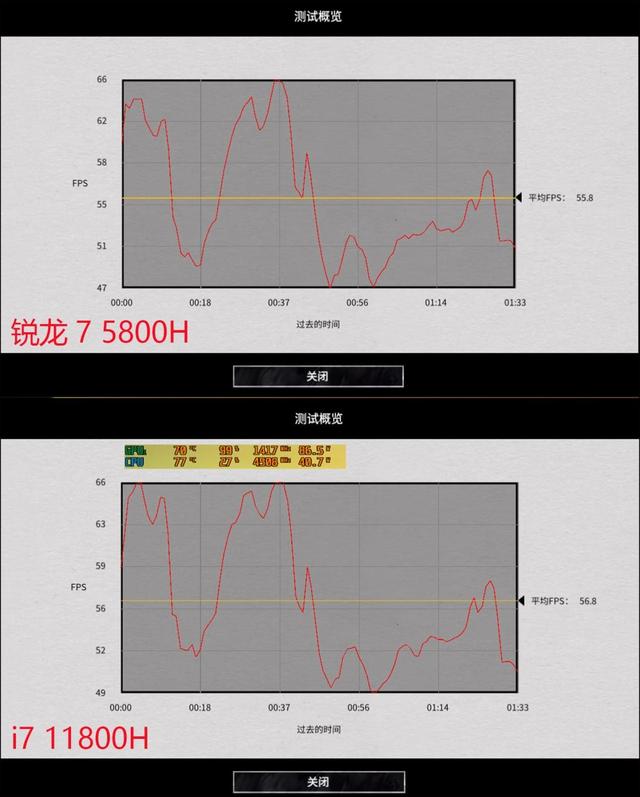 从游戏测试来看,虽然锐龙7 5800H的RTX 3060低了10W,独显的理论测试成绩也不如i7 11800H的95W款RTX 3060,但是游戏表现却是互有胜负,差距都在几帧的范围内,游戏体验几乎没区别,总体是一个级别的表现。至于原因,一方面应该是显卡功率10W的差异影响较小,因为在游戏中,95W款的RTX 3060其实大多数时候处于90W左右的功率状态;另一方面锐龙处理器对功率要求低,系统分配更多功率给独显,从而让系统总体游戏性能有更好的发挥,表现也就相差无几了。