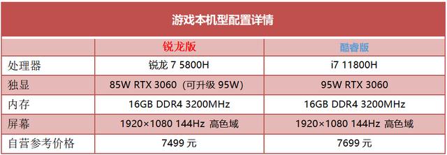 针对这个不少玩家感兴趣的问题,牛叔找了测试数据库中同一台机器的锐龙7 5800H/酷睿i7 11800H两个版本来比试较量一番,它俩搭载的是大家关注度高的RTX 3060独显,并且机型设计基本一致,硬件配置情况如下所示: