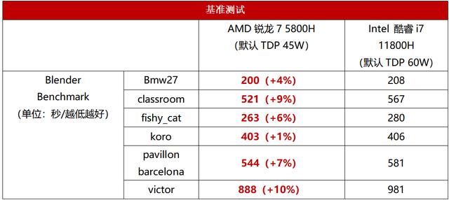 如果将两者的功耗差距拉小,结果会是怎么样呢?同款机型没有数据,这里有以前测过的AMD超威卓越平台配置的5800H和11800H对比的数据可以参考,可以看到,在功耗差距为15W时,5800H已经全部超过了11800H,如果双方同功耗,估计领先幅度会更大。