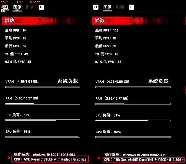 2K高画质,锐龙7 5800H款81fps,i7 11800H款79fps。