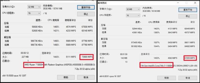 另外,7zip基准测试中,锐龙7 5800H大幅度领先于i7 11800H。