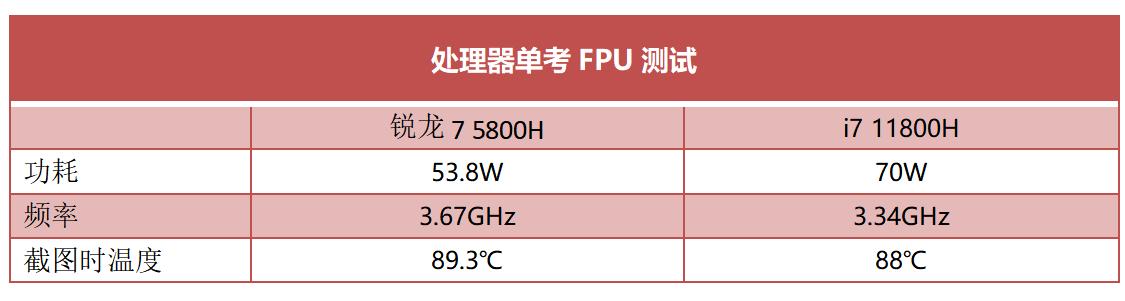 单考FPU测试项目是考查机型的满载性能释放情况,包含考机时的处理器的功率、频率和温度。两台机器均在最大风扇模式下考机,持续半小时以上,不同处理器性能释放如下:锐龙7 5800H的满载情况是53.8W/3.67GHz/89.3℃;i7 11800H的满载情况是70W/3.34GHz/88℃。
