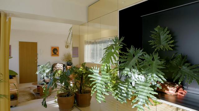 将电视机的显示区域放回储物盒左侧。窗户下面放了沙发,布艺窗帘换成了更简单的百叶窗。视野瞬间开阔,入射光量可以随意控制。太美了!