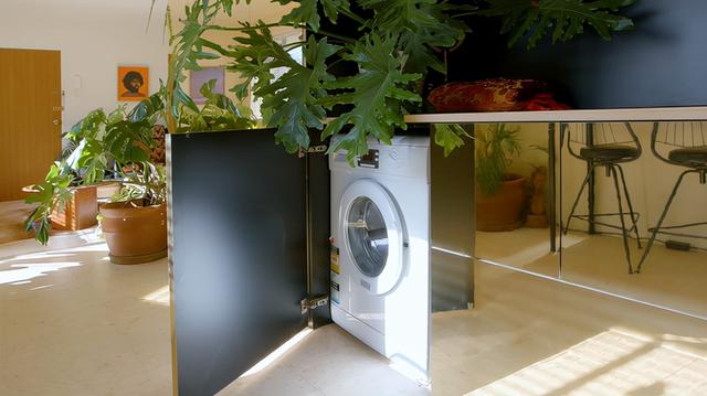 一台洗衣机和烘干机是藏在地下室的一部分。