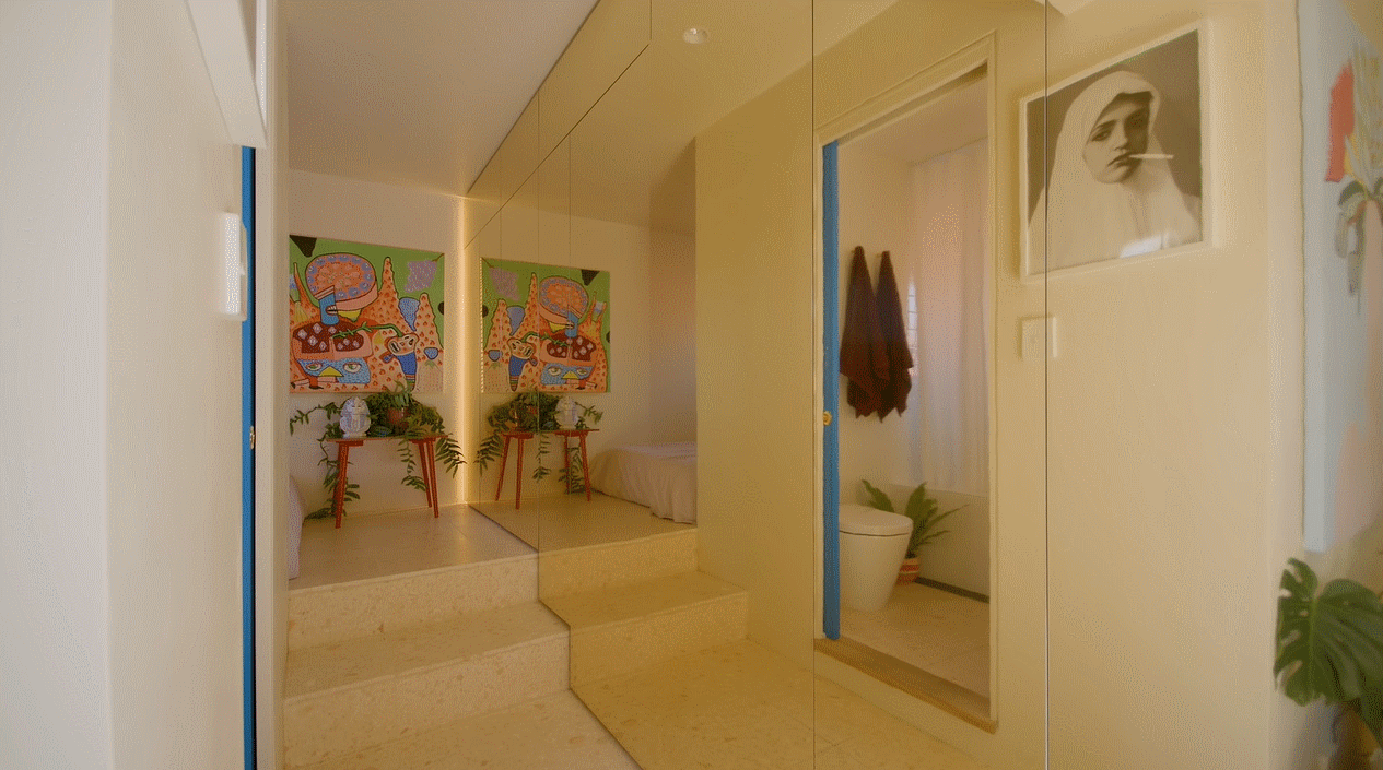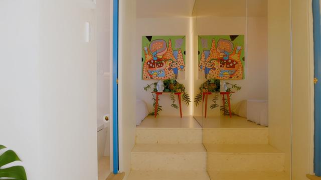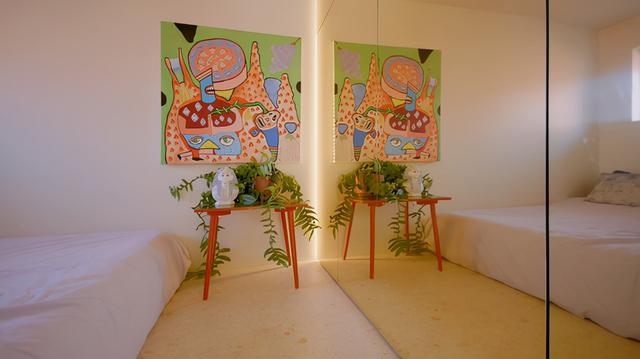 角落里的小凳子是用来摆放装饰品和存放手机、茶杯的,但目前主要是用来堆放绿植。墙画是男主人自己手绘的抽象作品,很有纪念意义。床对面是过道衣柜的延伸结构,储物能力强,墙角嵌有灯带。