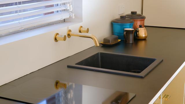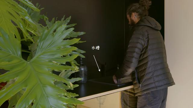 这里有一个水槽,经过严格的防水、防漏、防潮处理,安装了直饮水装置。打开水龙头就可以直接喝水,在这里煮咖啡也很方便。台面、水槽、水龙头、背景全部采用哑光黑色材质,减少突兀感。