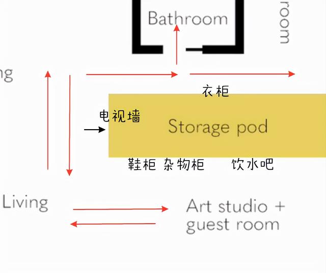 整个设计围绕这个储物区展开,三面都有强大的储物功能。卧室是过道衣柜,房间是鞋柜、杂物间和吧台,客厅是电视背景墙。