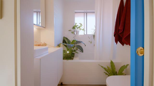 因为我平时喜欢洗澡,我建了一个浴缸。巧妙的是,浴缸侧面还设计了一个小花坛。洗澡的时候,感觉自己置身于自然环境中,尤其是减压。这个浴缸也可以站着洗澡,拉一下浴帘就可以分出干湿。