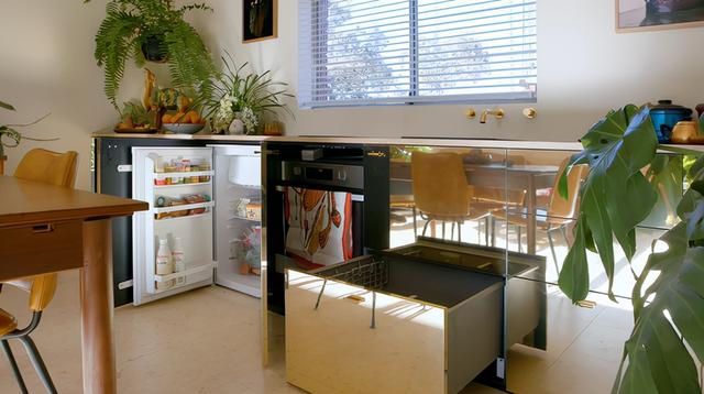 冰箱烤箱藏在柜子里,还有很多抽屉式的柜子,储物能力很强。