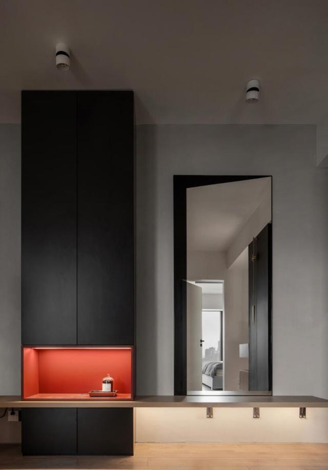 入户门右侧设计有换鞋区。悬挂式隔层不仅在视觉上使其轻盈优雅,还提高了换鞋时的舒适性。同时,在顶部和底部分别安装了全长镜子,并隐藏了暖灯,在提升空间功能的前提下,也为空间增添了一丝温暖。当然,旁边一组储物柜的设计再次弥补了收纳需求。
