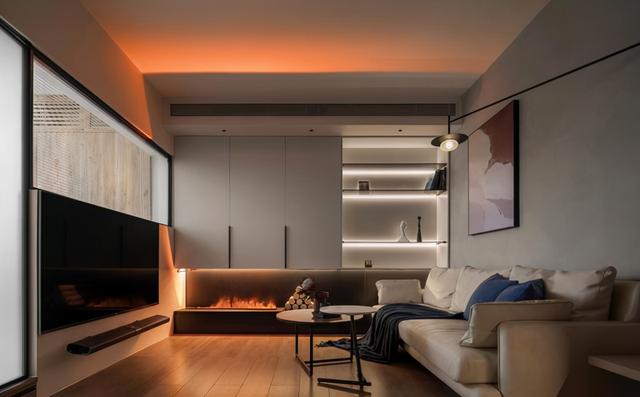 空间结构重新规划时,客厅的采光其实受到很大影响。但对于追求空间氛围的屋主和情侣来说,更符合沉稳冷静的主题。同时,通过大量的辅助灯光,以及壁炉的对比,巧妙地实现了冷暖之间的平衡,没有任何压抑感。