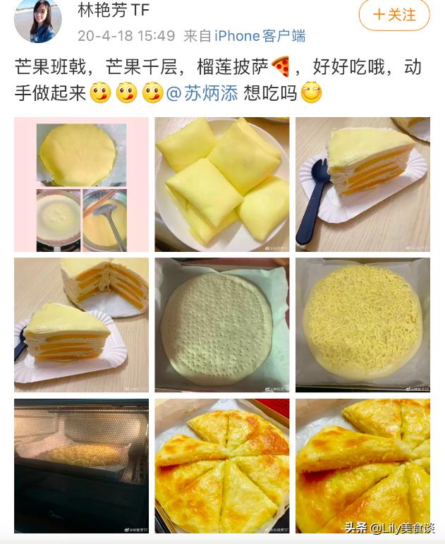 林艳芳还晒了自己做的芒果班戟,芒果千层、榴莲披萨等等,看着都是相当诱人的,并且@苏炳添称想吃吗?