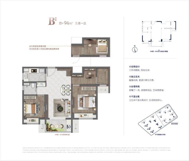 该户型是当下十分流行的小三室设计, 做到了4个开间朝南,采光和视野效果俱佳,客厅与阳台相连,整体感觉非常的明亮,而且没有浪费空间,在细节上,卫生间干湿分离,主次卧拉开一定距离,私密性也更高,入户就是厨房,给生活也增添了舒适与方便。