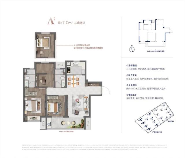 建面约110平米的户型定位则更改善,三房两厅两卫,空间也更为阔绰,足可满足一家三代生活所需,在设计上采取动静分离,右侧活动区与左侧休息有效划分,且纳入宽境阳台,南北通透性更佳,如果资金允许,强烈建议买入这个一步到位的户型!