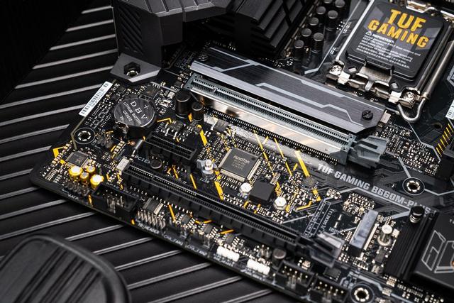 Intel第12代酷睿的另一大亮点是增加了对PCIe5.0的支持,能够提供两倍于PCIe4.0的数据传输速度。华硕TUF GAMING B660M-PLUS WIFI D4重炮手也为玩家们提供了PCIe5.0×16插槽(使用处理器的PCIe5.0通道),已经为下一代支持PCIe5.0的显卡做好准备。值得一提的是,PCIe5.0对电气性能要求更高,所以该插槽使用了SMT生产工艺,并集成金属强化层提高稳定性,保护显卡插槽不易变形损坏,可为显卡提供优异的支撑和防护能力。