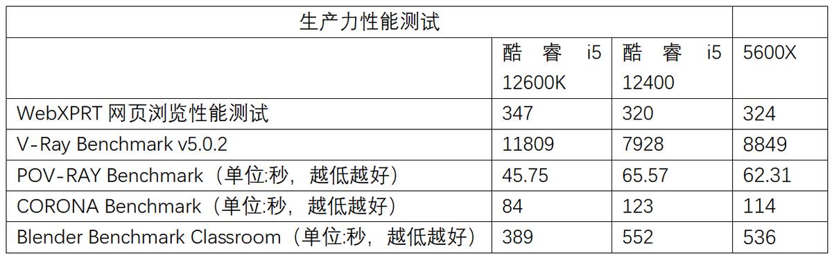 生产力测试中,在对单核性能较为敏感的WebXPRT网页浏览性能测试中酷睿i5 12400和锐龙5 5600X几乎战平,只有约1%的差异。而各种渲染软件中,对多核性能则有更多的需求,酷睿i5 12400总的来说是略低于锐龙5 5600X。这主要和它的全核心频率仅有4.0GHz有关,相对竞品来说低了不少。但总体来看差距不大,可见Golden Cove架构的性能核效率确实很有竞争力。