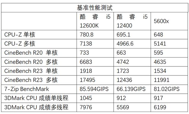 从基准测试来看,酷睿i5 12400凭借4.4GHz的最高睿频,在大部分单核测试中分数也明显高于锐龙5 5600X,而且优势还比较明显,只在3DMark CPU单线程测试中,两者基本战平。从单核性能来看,酷睿i5 12400的部分基准测试得分已经接近甚至超过上代的旗舰酷睿i9 11900K,可见第12代酷睿的IPC性能提升确实非常恐怖。多线程部分,酷睿i5 12400和锐龙5 5600X两者互有输赢,酷睿i5 12400在Cinebench R20/R23多线程测试中略有优势,其它测试则是锐龙5 5600X领先。当然,更高端的酷睿i5 12600K还是有着自身的优势,不但频率高出酷睿i5 12400不少,同时还多了4个能效核,所以无论是在单核性能还是多核性能方面,两者都有不小的差距。