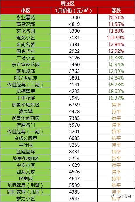 贾汪区统计的28个小区中,有7个小区价格上涨了,有7个小区价格下跌,还有14个小区价格维持不变。
