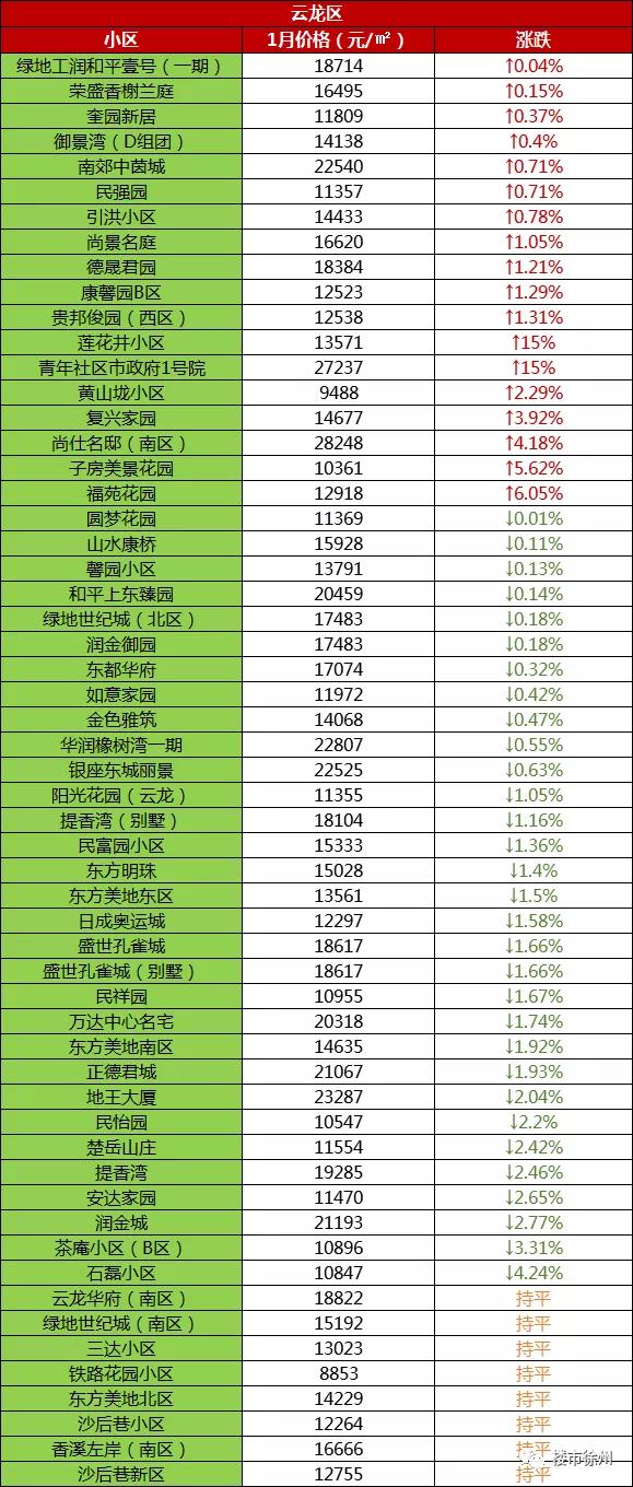 云龙区统计的57个小区中,有18个小区价格上涨了,有31个小区价格下跌,还有8个小区价格维持不变。