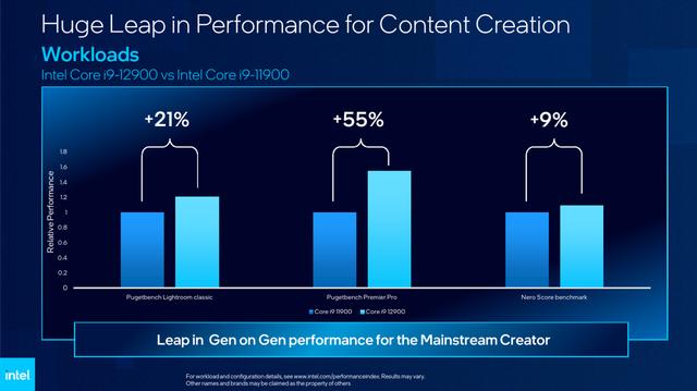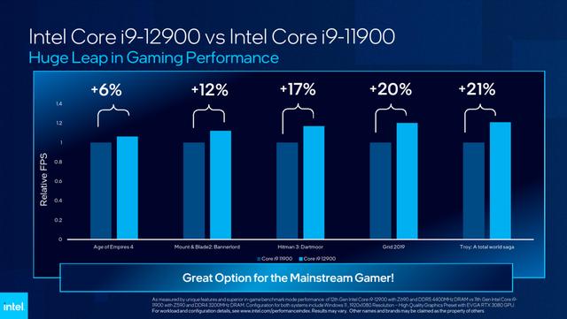 从官方数据来看,不带K的酷睿i9 12900相对酷睿i9 11900游戏性能最多提升了21%。