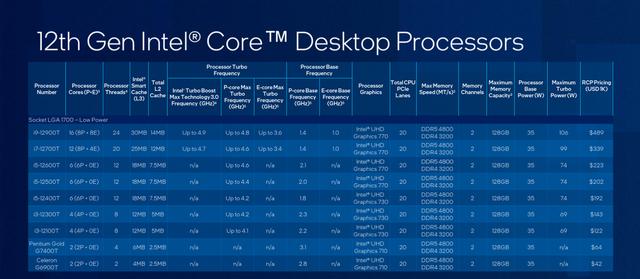 本次发布会上,Intel一口气发布了22款第12代酷睿台式机处理器产品,其中包括3款酷睿i9,包括酷睿i9 12900/i9 12900F/i9 12900T;3款酷睿i7,包括酷睿i7 12700/i7 12700F/i7 12700T;7款酷睿i5,包括酷睿i5 12600/i5 12600T/i5 12500/i5 12500T/i5 12400/i5 12400F/i5 12400T;5款酷睿i3,包括酷睿i3 12300/i3 12300T/i3 12100/i3 12100F/i3 12100T;两款奔腾,包括奔腾G7400/G7400T;两款赛扬,包括赛扬G6900/G6900T。具体频率和规格大家可以从图中看到,就不一一介绍了。