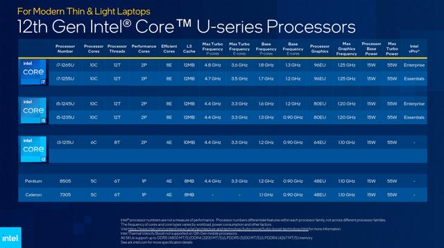U系列中的15W产品线首发了7款产品,最大加速功率都是55W。其中酷睿i7 1265U/i7 1255U都是2大8小10核心12线程,最高加速频率为4.8GHz,核显具备96个EU,工作频率1.5GHz。酷睿i5 1245U/i5 1235U也是2大8小10核心,核显EU数量减少到80个。酷睿i3 1215U具备2大4小6核心8线程,核显EU减少到64个。奔腾8505、赛扬7305都是1大4小5核心6线程,核显EU数量为48个,其中赛扬7305不支持睿频。