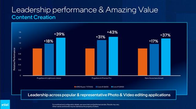 Intel的官方资料中还拿酷睿i9 12900和酷睿i5 12600和锐龙7 5700G对比了综合性能与生产力性能。从数据来看,酷睿i9 12900的CrossMark得分甚至比锐龙7 5700G高出44%,酷睿i5 12600也高出30%,其它项目两者的优势也非常明显。而且可以看到,生产力应用负载越重,酷睿i9 12900和酷睿i5 12600相对锐龙7 5700G的优势越明显。