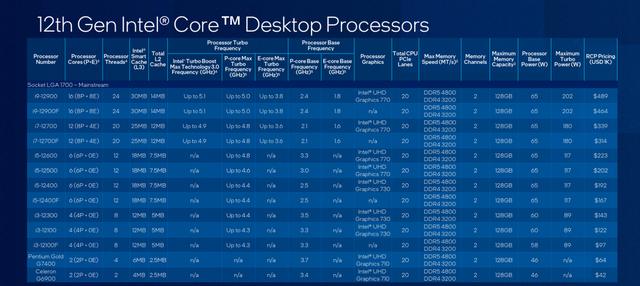 核显方面,酷睿i9、酷睿i7、酷睿i5 12600/12500系列都是UHD 770,酷睿i5 12400系列、酷睿i3都是UHD 730,奔腾、赛扬都是UHD 710。内存方面,全线默认支持双通道DDR5 4800和DDR4 3200,最大容量都可支持到128GB,就算是赛扬也没打折。全线都支持处理器直出PCIe 5.0×16 + PCIe 4.0×4。