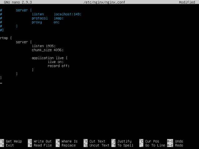 rtmp { server { listen 1935; chunk_size 4096; application live { live on; record off; } }}