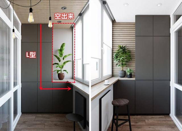 这时阳台柜可以设计成L型,靠墙的柜可以直接安装在顶部,而靠近窗户的窗户上部会空着,形成L型。这样的阳台柜不会影响开窗,同时增加阳台的白色空间,压抑感会大大降低。