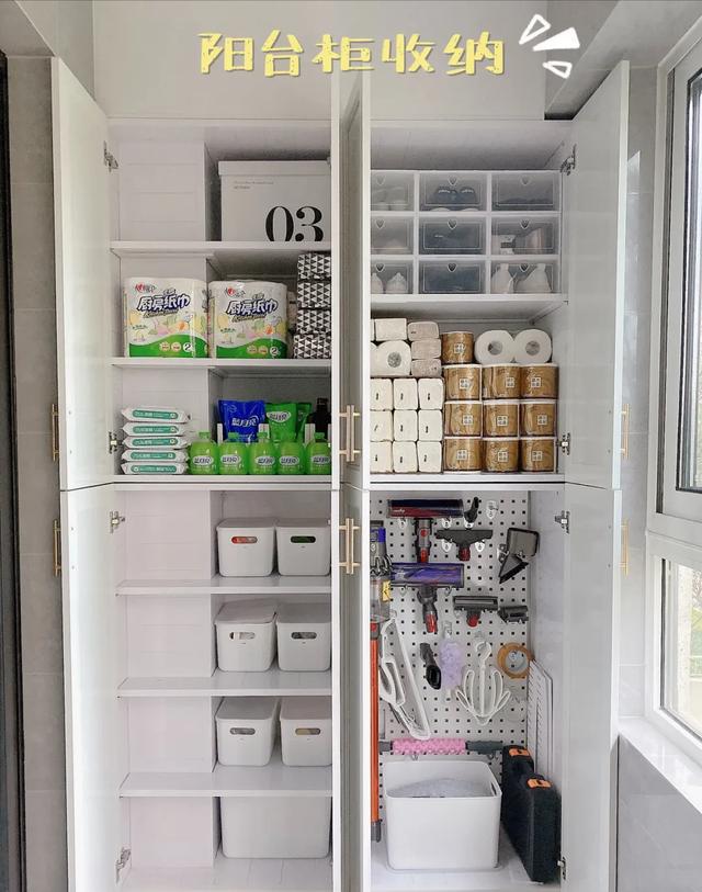 如果阳台两侧都有实体墙,那么顶天立地的大收纳柜是最好的选择。毕竟它的储物空间最大,实用性最强。