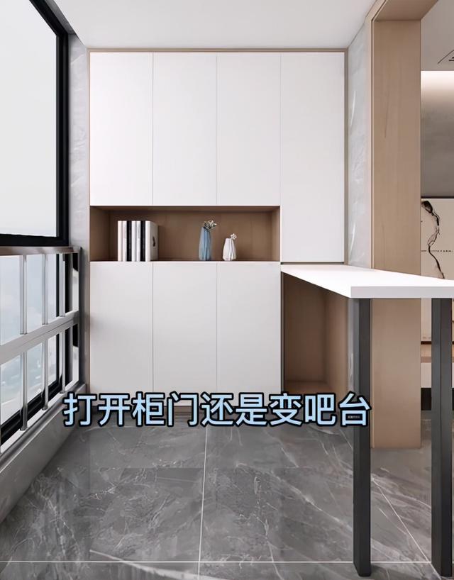 所以,我们要动脑筋,让阳台柜的设计更加细致。这个时候给出的建议是在阳台柜中设计一个隐藏的吧台。