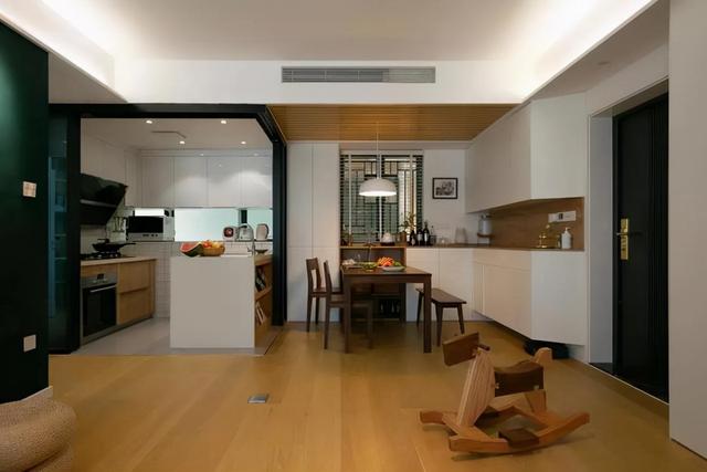走进房间,右边是酒店区域,因为总面积相对有限,不可能设计一个单独进入门厅的方案。设计师的鞋架放在餐厅柜子里放在一起,脱鞋的时候可以马上坐在酒店的凳子上,非常方便。厨房和餐厅中间的墙拆除后,餐后区域看起来也宽了很多,采光率也提高了。