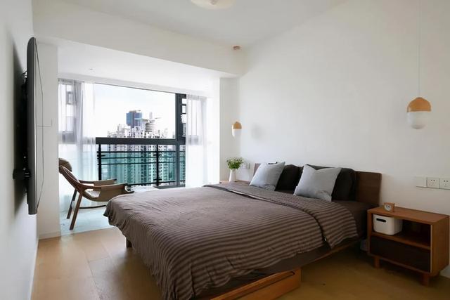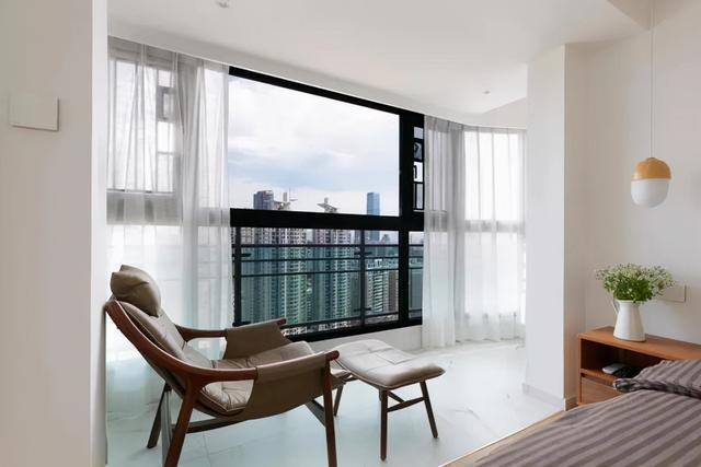 主卧的亮点是内置观景台生活阳台。设计师在卧室里列出生活阳台,放置了一组休闲桌椅,将它变成了一个放松娱乐的室内空间,提升了日常生活的格调。