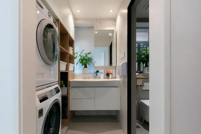 为了更好的减轻厨房的工作压力,设计师做了双分体式的设计方案,将卫生间的脸盆移位,同时保证了湿区系统的划分。水槽左侧订购了整理柜,全自动洗衣机和烘干设备也很好地摆放在里面。