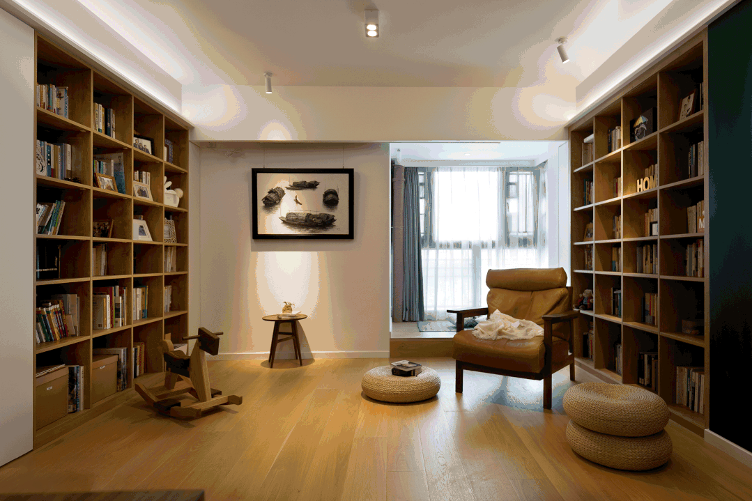 大客厅摆脱了传统的“老三样”布局,双面电视背景墙全部做成大书柜,中间区域放置单椅和蒲团,让大客厅同时兼具休闲和小书房的功能。设计师把原来卧室的凸窗改成了榻榻米露台,可以作为布艺沙发的填充物,坐在上面可以欣赏美景。