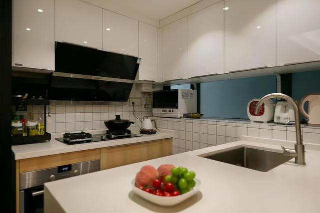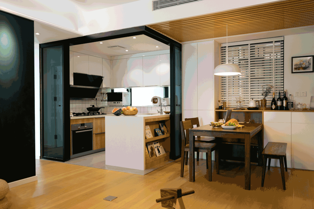 玻璃推拉门采用挂轨设计方案,一侧四联动,另一侧三联动。当厨房的玻璃门完全打开后,可以隐藏在墙内,节省了更多的室内空间。