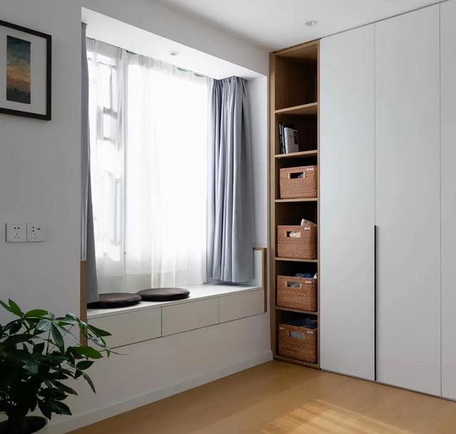 壁式衣柜设计方案在卧室的人口中,设计师在靠近卧室凸窗时特意腾出了一排开放式橱柜,可以作为书柜使用。因为房子的结构独特,卧室的卧室凸窗无法敲掉,所以设计师在卧室凸窗上安装了三个抽屉柜,不仅改善了室内空间,还增加了卧室凸窗的相对高度,坐在上面正好。